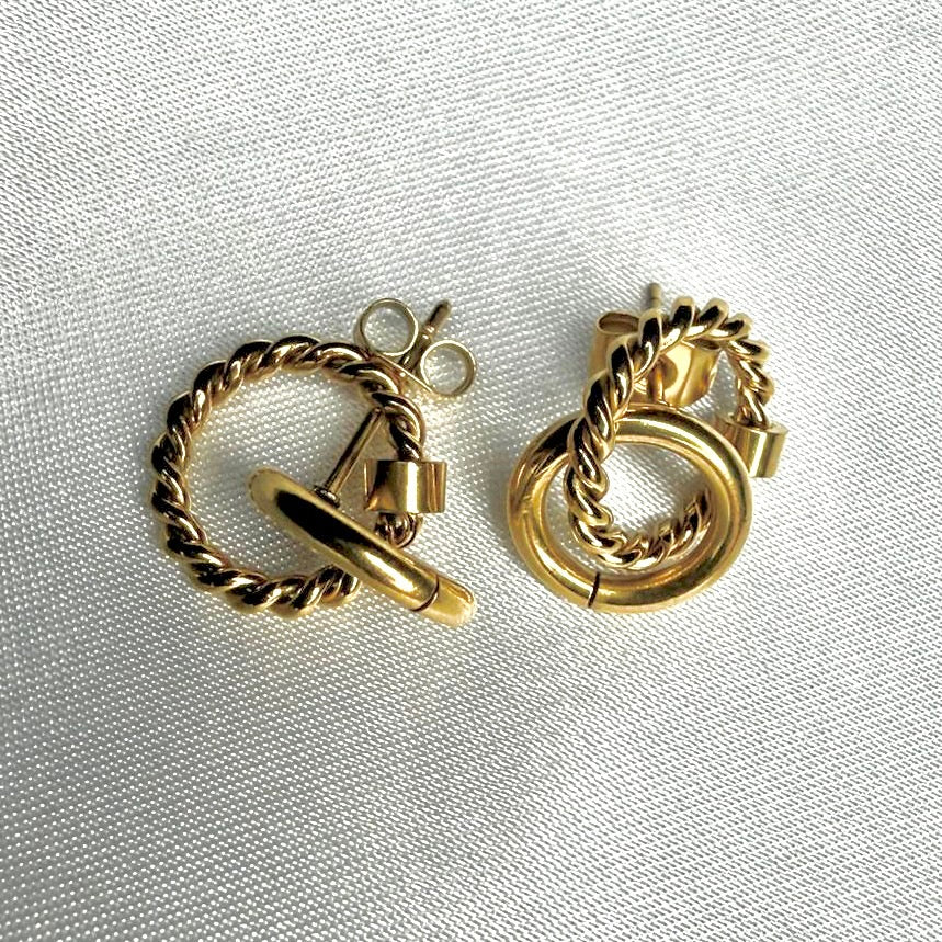 Un bijou à la fois moderne et intemporel, les boucles d'oreilles CHLOÉ séduisent par leur design audacieux et leur jeu de textures. En finition dorée brillante, elles captent délicatement la lumière et encadrent le visage d’une élégance affirmée. Réalisées en acier inoxydable, elles résistent au temps et à l’eau tout en conservant leur éclat. Elles se composent d'un anneau torsadé et d'un anneau lisse orné d'un fermoir T-bar décoratif, créant un look sophistiqué et contemporain, parfait pour sublimer aussi bien une tenue du quotidien qu’un look plus habillé.