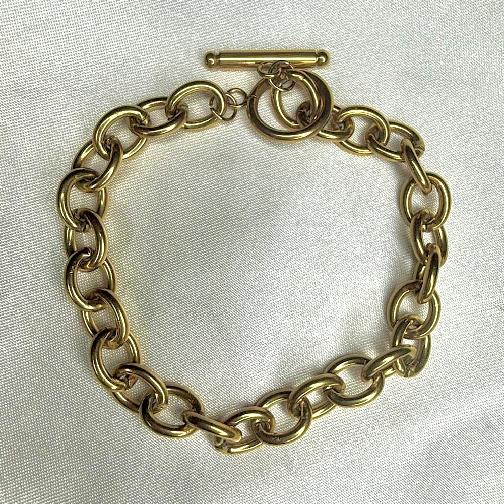Un bijou à la fois moderne et intemporel, le bracelet FLAVIE séduit par son design massif et tendance. En finition dorée brillante, il capte délicatement la lumière et habille le poignet d’une élégance forte. Réalisé en acier inoxydable, il résiste au temps et à l’eau tout en conservant son éclat. Les maillons larges et entrelacés apportent un volume contemporain, rehaussé par un fermoir de type toggle (T-bar) qui est à la fois pratique et esthétique. Parfait pour sublimer aussi bien une tenue du quotidien qu’un look plus habillé.