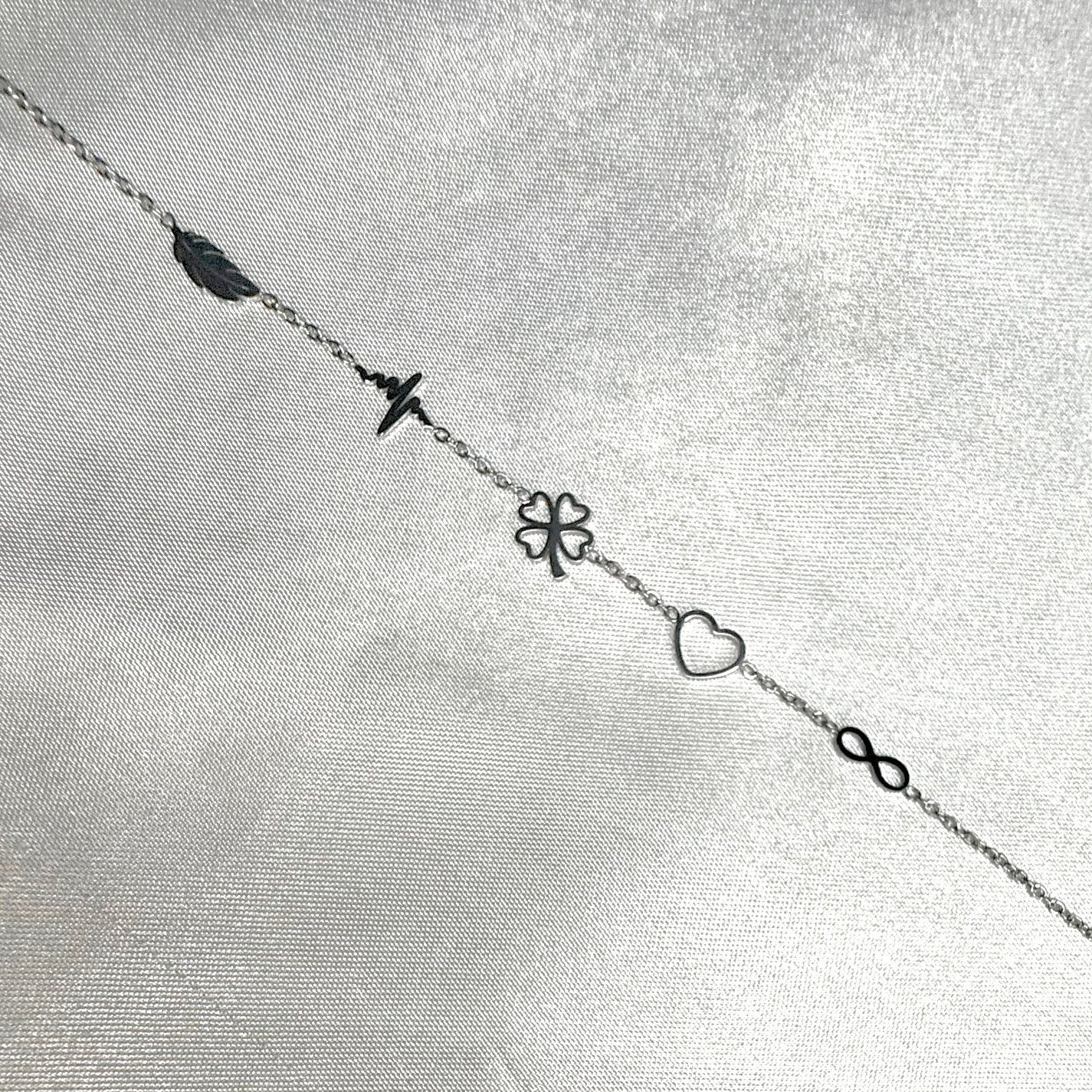 En finition argentée et polie, il capte délicatement la lumière et habille le poignet d’une élégance pleine de sens. Réalisé en acier inoxydable, il résiste au temps et à l’eau tout en conservant son éclat. Sa chaîne délicate est ponctuée de trois motifs plats et découpés : un cœur ajouré, un trèfle à quatre feuilles et une ligne d’électrocardiogramme, symbolisant l'amour, la chance et la vie. Parfait pour sublimer aussi bien une tenue du quotidien qu’un look plus habillé.