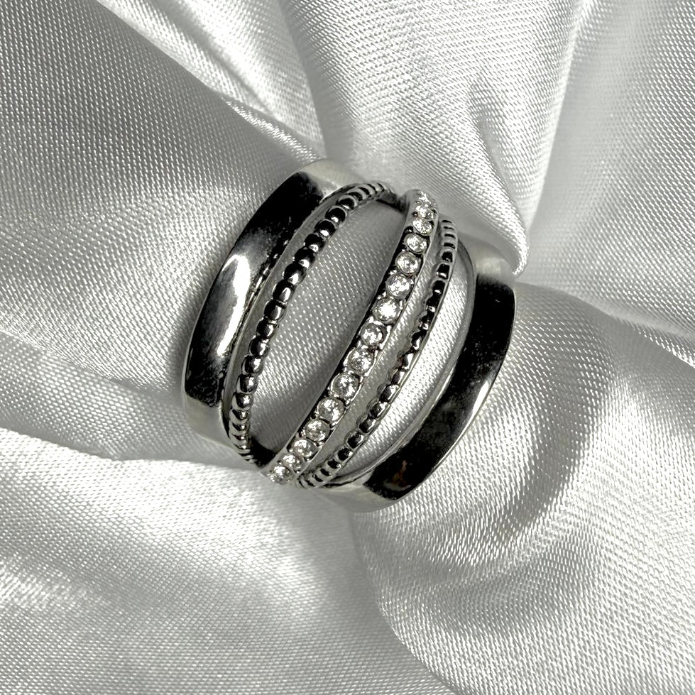 En finition argentée brillante, elle capte délicatement la lumière et habille la main d’une élégance raffinée. Réalisée en acier inoxydable, elle résiste au temps et à l’eau tout en conservant son éclat. L'effet de cinq bandes superposées, mêlant des textures lisses, perlées et une ligne de petits zircons scintillants, apporte une touche sophistiquée et une belle présence, parfaite pour sublimer aussi bien une tenue du quotidien qu’un look plus habillé.