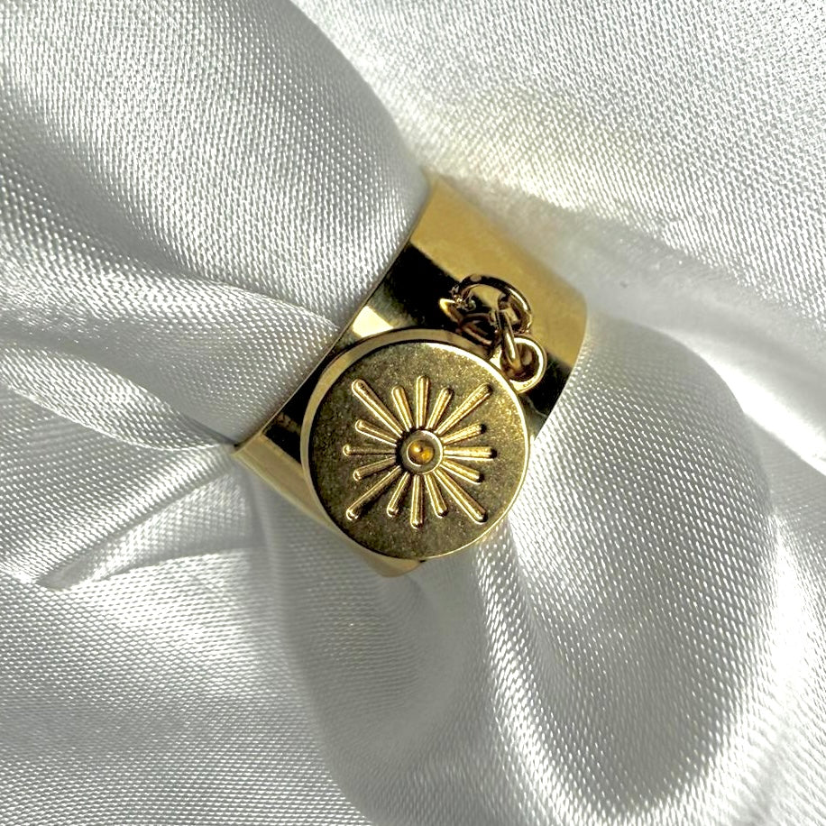 En finition dorée, elle capte délicatement la lumière et habille la main d’une élégance douce et féminine. Réalisée en acier inoxydable, elle résiste au temps et à l’eau tout en conservant son éclat unique. Son pendentif, une petite médaille gravée d'un motif de soleil stylisé et graphique, apporte une touche minimaliste et rayonnante. Parfaite pour sublimer aussi bien une tenue du quotidien qu’un look plus habillé, elle est ajustable pour un confort parfait.