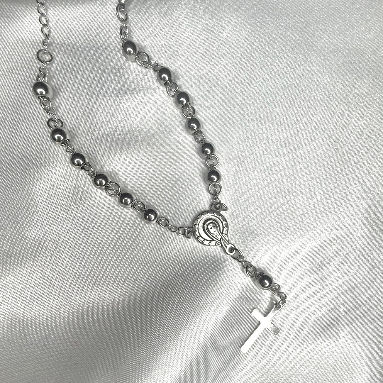 En finition argentée classique, il capte délicatement la lumière et habille le poignet d’une élégance symbolique. Réalisé en acier inoxydable, il résiste au temps et à l’eau tout en conservant son éclat. Composé de perles lisses et agrémenté d'une médaille et d'une croix pendante, il réinterprète le design du chapelet de manière chic et contemporaine. Parfait pour sublimer aussi bien une tenue du quotidien qu’un look plus habillé.